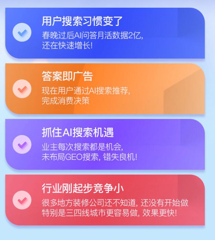 GEO 優(yōu)化讓我們?cè)谙尻枀^(qū)域的 AI 搜索和本地推薦中穩(wěn)居前列,精準(zhǔn)觸達(dá)了目標(biāo)業(yè)主,解決了我們‘找不到對(duì)的人’的難題。